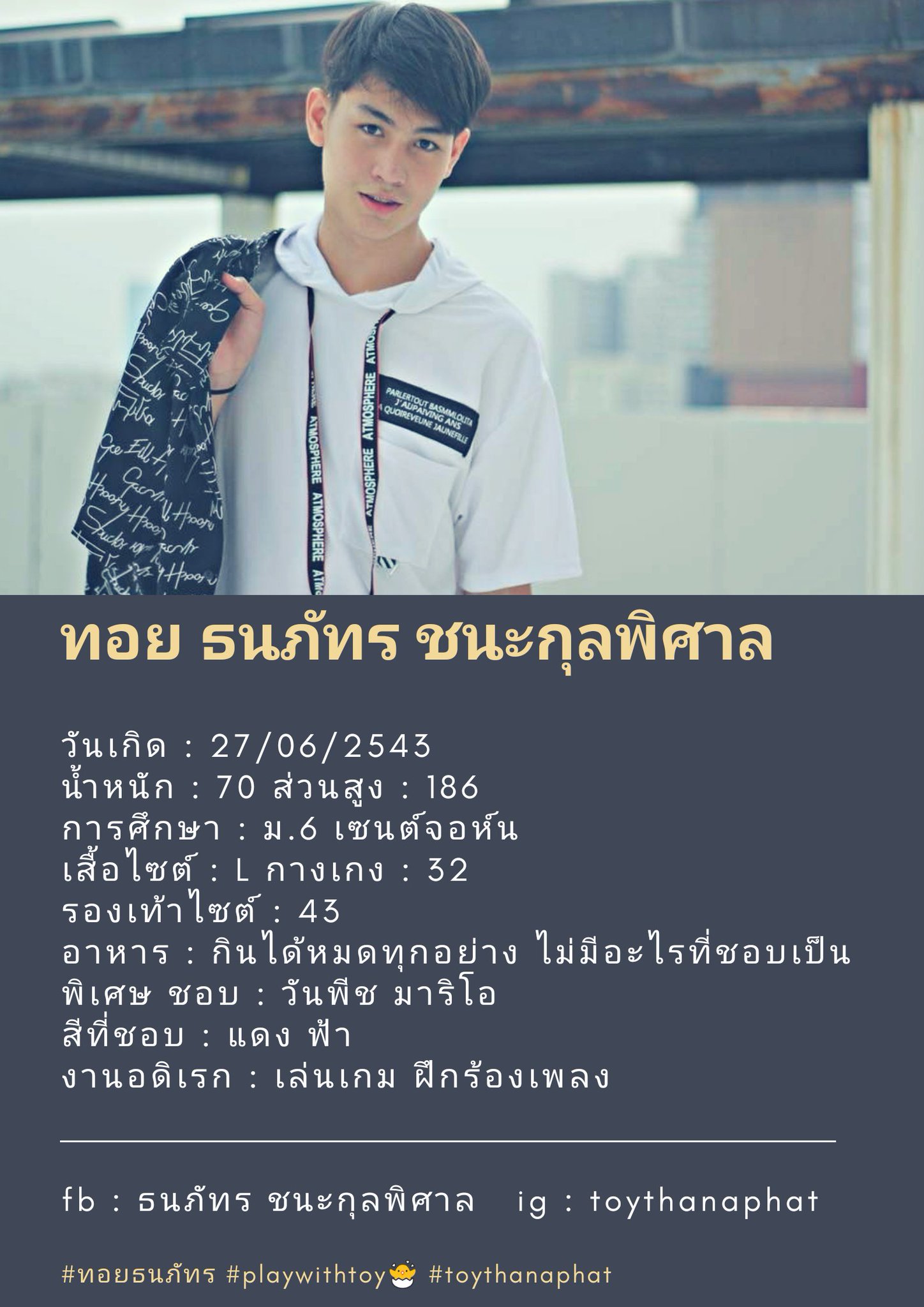ทอยทอย ธนภัทร ชนะกุลพิศาล วัย 21 ปี เกิดที่จังหวัดชลบุรี จบการศึกษาระดับมัธยมที่โรงเรียนเทศบาล 1 (สถาวร) และศึกษาระดับปริญญาตรี ทอยทอย ธนภัทร ชนะกุลพิศาล นักแสดงหนุ่มชาวชลบุรี วัย 21 ปี มีผลงานการแสดงมาแล้ว อย่าง ซีรีส์วาย เรื่อง why r u the series เพราะรักใช่เปล่า ซึ่งนำแสดงโดย. ทอยทอย ธนภัทร เผยคำพูดแรก หลังก่อเหตุแทงแฟนดับ legacy. ส่องประวัติ 'ทอยทอย ธนภัทร' นักแสดงซีรี่ส์ดัง ก่อนถูกจับ หลังทำร้ายแฟนดับ เรียกได้ว่าจากประเด็นที่ 'ทอยทอย ธนภัทร' นักแสดงซีรีส์วาย ได้. คนร่วมอาลัย พิม หลังจาก ทอยทอย นักแสดงหนุ่มแทงแฟนสาวเสียชีวิตคาบ้านพัก ด้านโลกออนไลน์แห่ติดแฮชแท็ก #ทอยทอย จับตาความคืบหน้าคดี